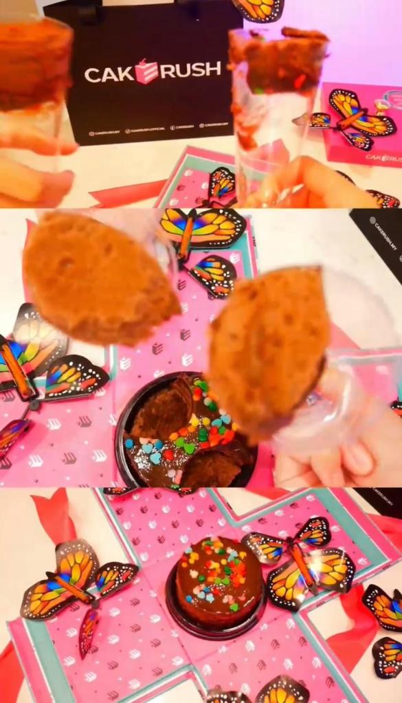 Cracking open this Cake Explosion Gift Box definitely caught us by surprise! Likened to unlocking a treasure chest full of gold, opening this sent us into a whole new universe of sweetness and colours! The second we lifted the lid, colourful butterflies sprang out of the box! The vivid bright colours a/nd flying butterflies caught our girls’ attention and both of them were bursting with excitement.